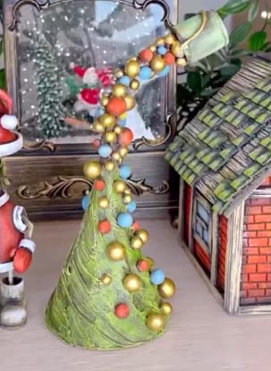 Создаём каркас, делаем форму и фактуру ёлочки и ведёрка, лепим шарики и окрашиваем яркими акриловыми красками