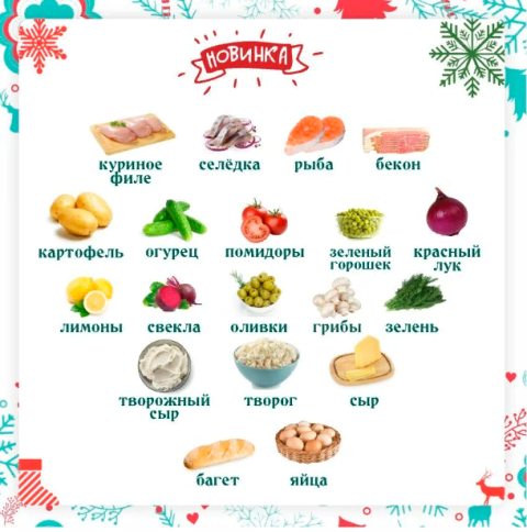 Новогоднее меню рассчитано на 4 персоны. Внутри вы найдете рецепты 3 ярких закусок, 2 потрясающих салатов и одного умопомрачительного горячего блюда! Все очень грамотно подобрано, чтобы зайти в магазин, закупиться по предложенному списку продуктов и потом из них приготовить потрясающий стол!