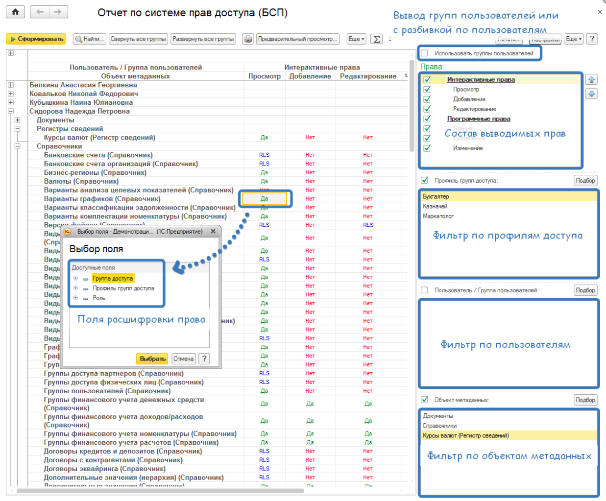 Получение необходимой информации по правам доступа в разрезе групп доступа, профилей групп доступа, пользователей / групп пользователей, объектов конфигурации и ролей. Легко можно настроить состав и порядок вывода информации по правам, настроить необходимые фильтры и получить более детальную расшифровку по группировкам отчета.
