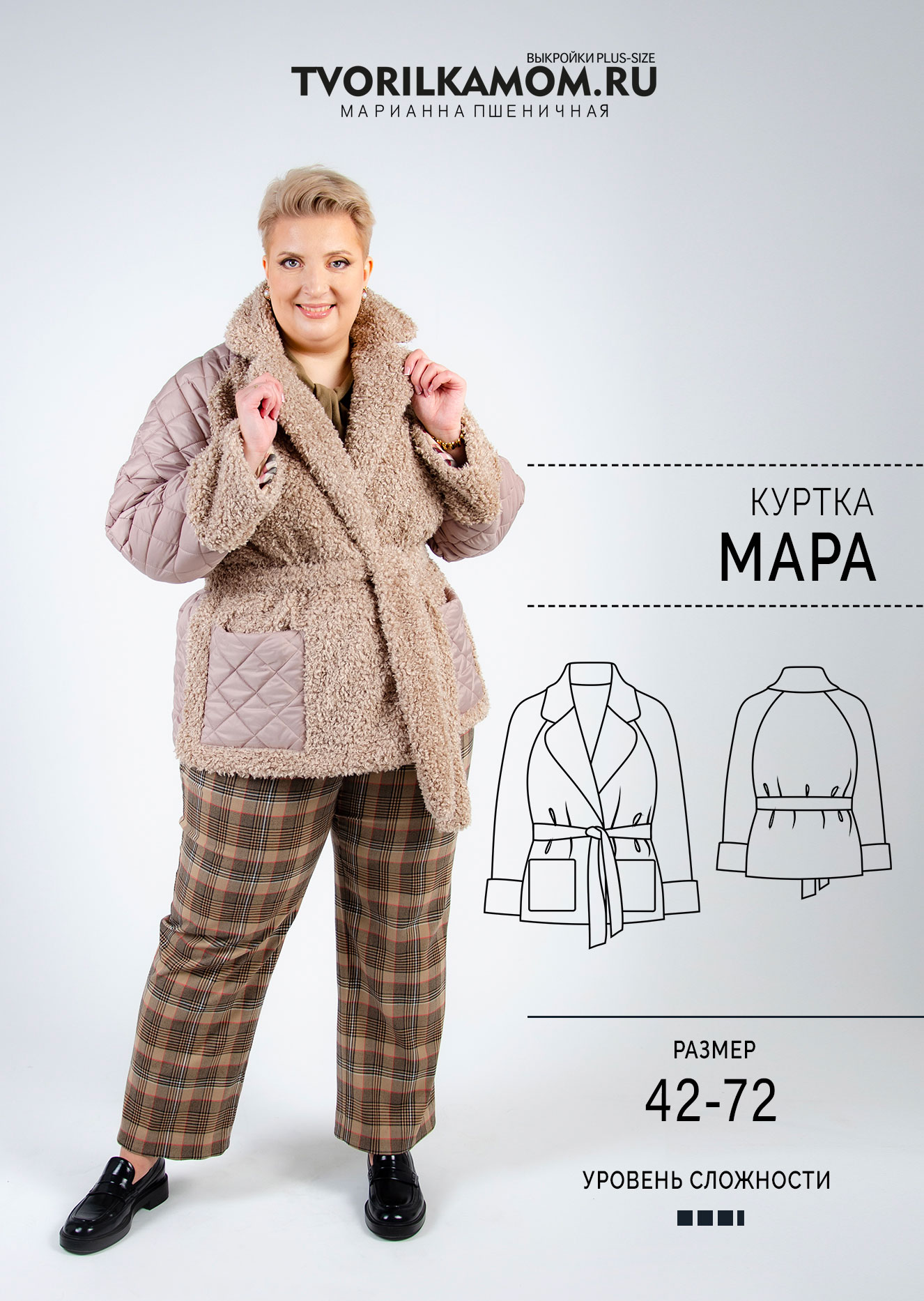 Выкройка Куртка «Мара» Куртка реглан на подкладке, два накладных кармана на подкладке. На рукавах имеются манжеты, воротник отложной пиджачного типа. Имеется пояс. Куртку можно шить из стежки и сочетать ее с искусственным мехом, так же из пальтовой ткани. Изделие возможно сделать с пуговицами, магнитными кнопками или без.