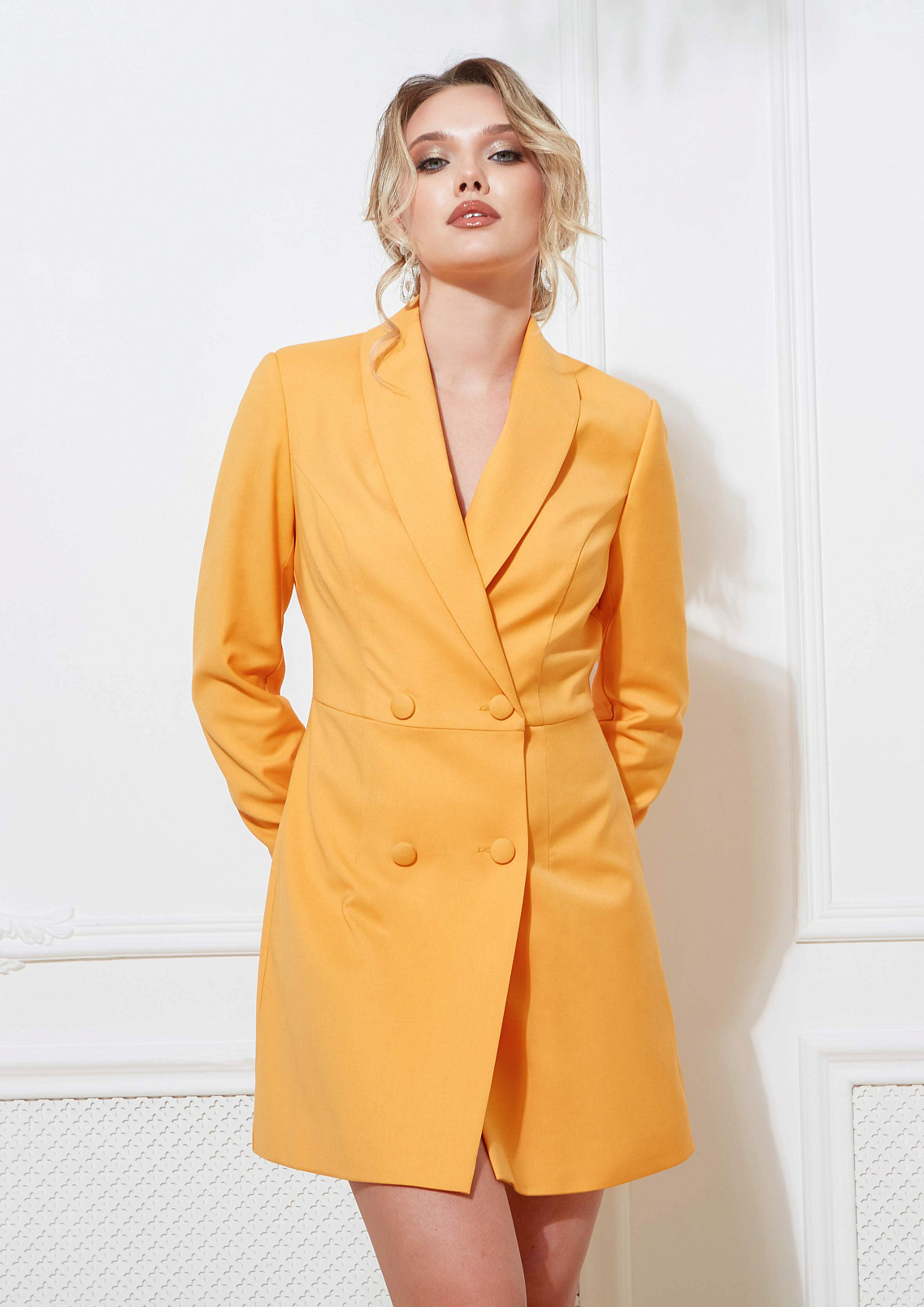 Платье-жакет длиной мини, прилегающего силуэта, отрезное по линии талии с двубортной открытой застежкой на 4 прорезные петли и