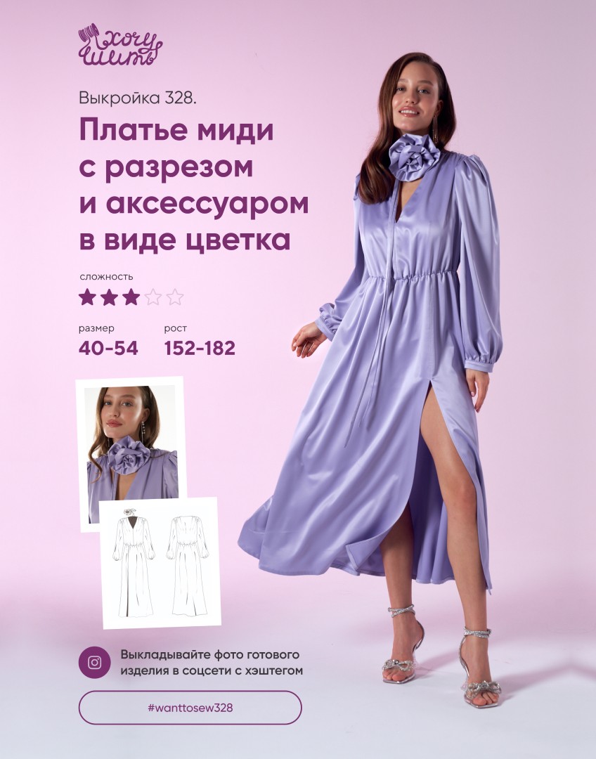 [Шитьё] Платье миди с разрезом и аксессуаром в виде цветка №328. Размер 40-54. Рост 164 [wanttosew]