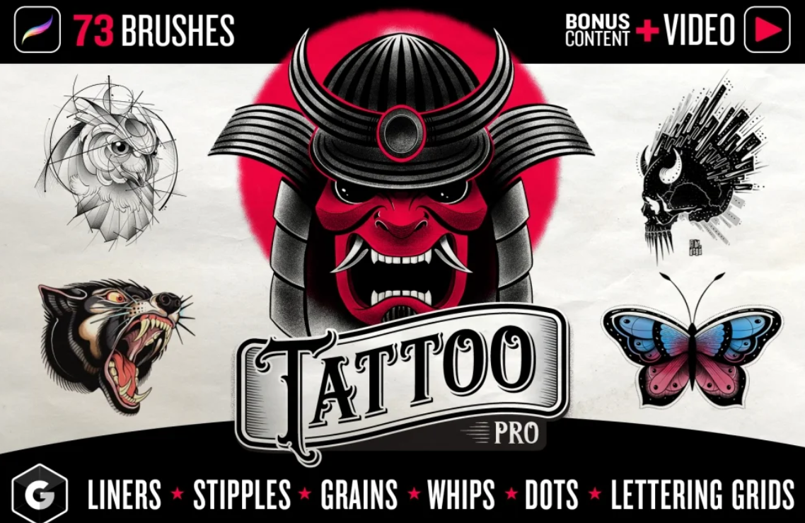 Самый аутентичный пакет для создания иллюстраций в стиле татуировки — Tattoo Pro для Procreate! Включая 73 исключительных кисти — Liners, Stipples, Grains, Whips, Dots и Lettering Grids.